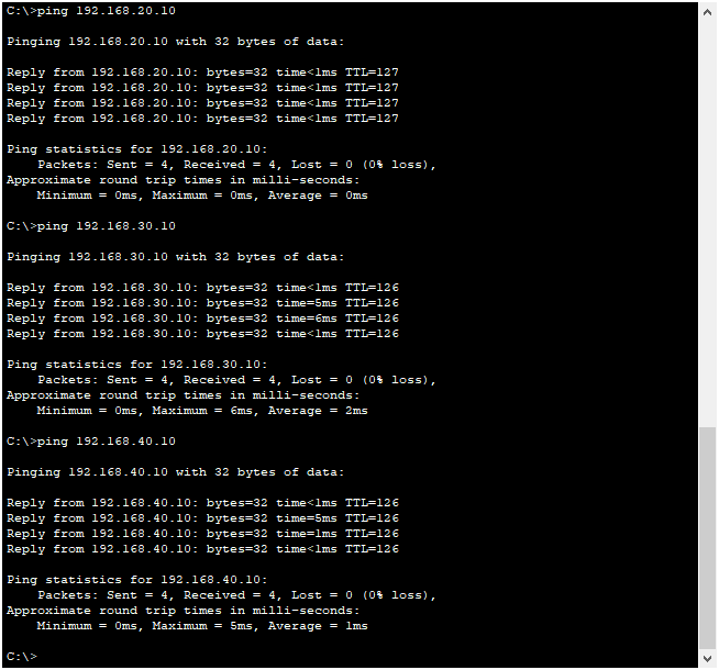 | PC3 | Fa0 | 192.168.40.10 /24 | VLAN40 |