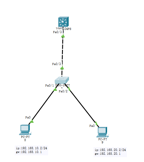 在交换机上分别将0/10/2添加到VLAN10VLAN20 并给连接三层交换机的0/3接口配置trunk模式: